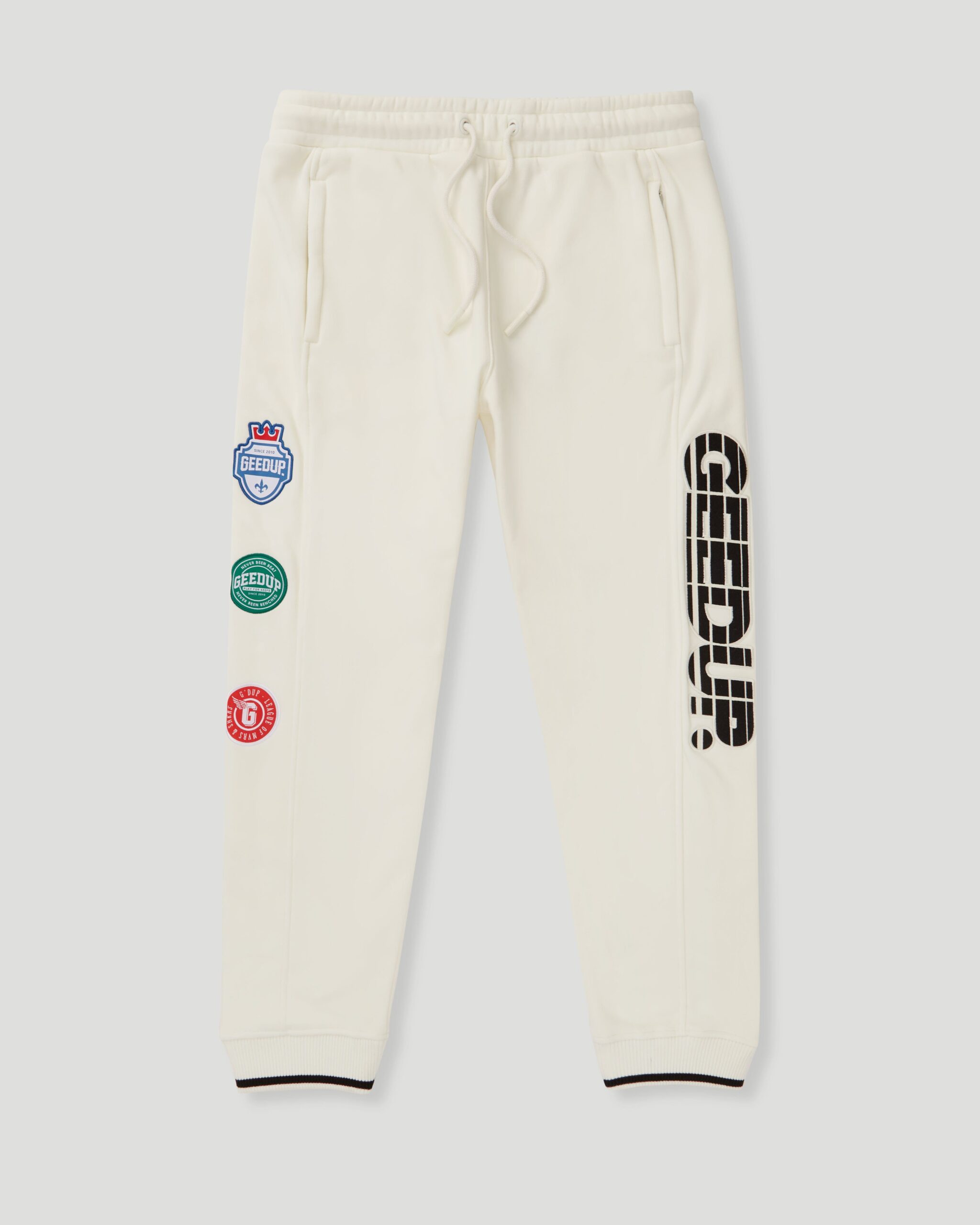 SKU: N/A Category: Bottom Tags: Geedup Bottoms, Geedup Sportsman Badges Trackpants Light Cream